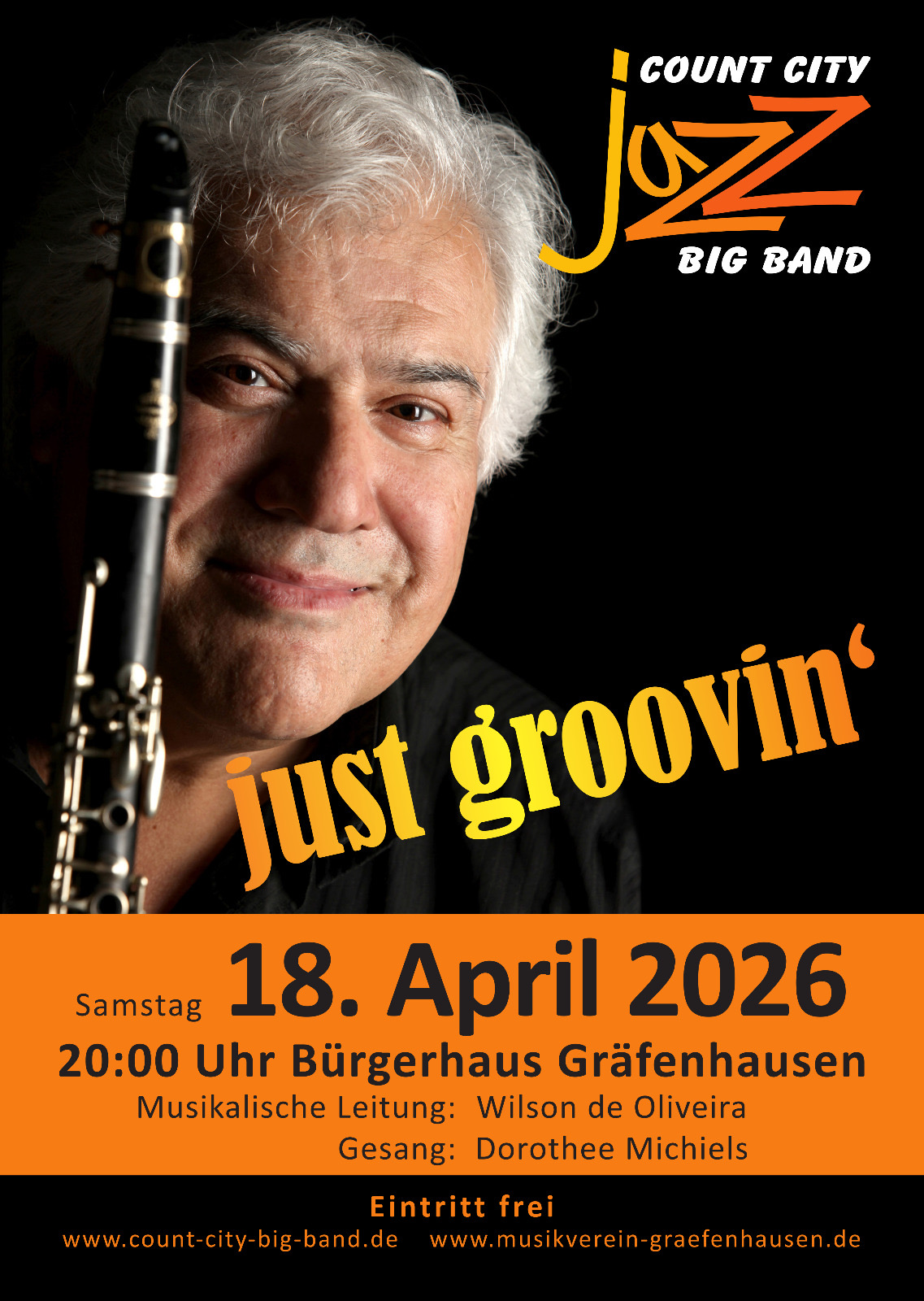 Am Samstag, den 18. April lädt die Count City Big Band vom Musikverein Gräfenhausen 1987 e.V. um 20 Uhr ins Bürgerhaus Gräfenhausen ein. Unter der musikalischen Leitung von Wilson de Oliveira steht der Konzertabend unter dem Motto „Just groovin’“ und widmet sich der modernen Big-Band-Musik.